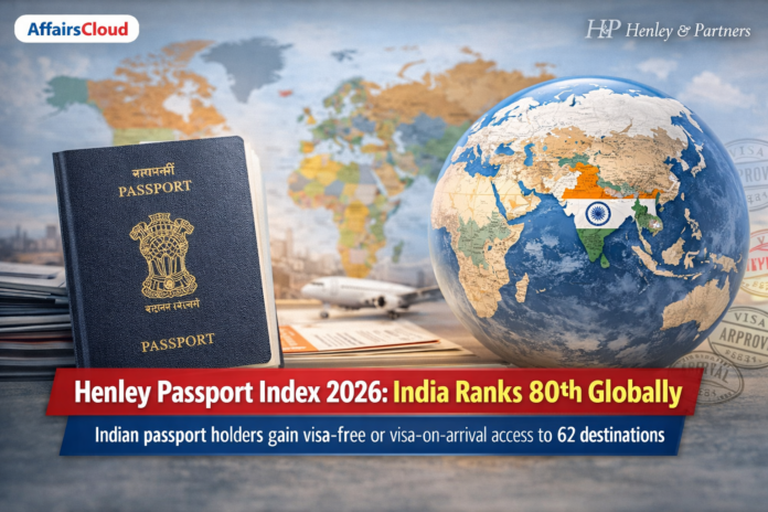 On January 13, 2026, Henley & Partners, a British consultancy expertized in investment migration, released Henley Passport Index (HPI) 2026 Global Ranking. As per the index, India has ranked 80th position, up from 85 in 2025, with visa-free or visa-on-arrival to 55 destinations, shared with Algeria and Niger.